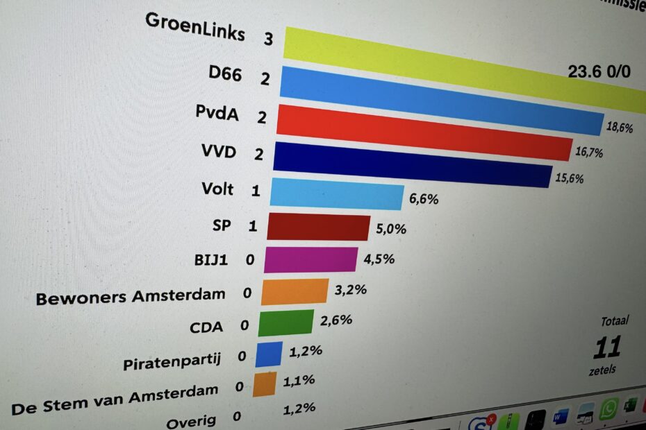 Groenlinks 3, D66 2, Pvda 2, VVD 2, Volt 1 en SP 1